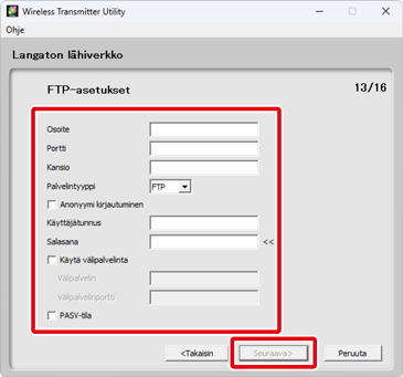 FTP-palvelimen asetukset ovat käytettävissä vain, jos FTP-lataus on valittu vaiheessa 6. Siirry Vaiheeseen 11, jos valittuna on toinen asetus. Kun olet säätänyt asetuksia, napsauta kohtaa Seuraava. Katso lisätietoja alla olevasta taulukosta.