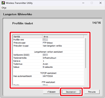 Jos haluat muokata olemassa olevaa verkkoprofiilia, valitse se ja napsauta kohtaa Seuraava. Jos haluat poistaa olemassa olevan profiilin, valitse se ja napsauta kohtaa Poista profiili. The Wireless Transmitter Utility -sovellusta ei voida käyttää sellaisten profiilien muokkaamiseen, jotka on suojattu kameran Salasanasuojaus-toiminnolla. Valitse Pois kohdassa Salasanasuojaus ennen profiilien poistamista tai muokkaamista.