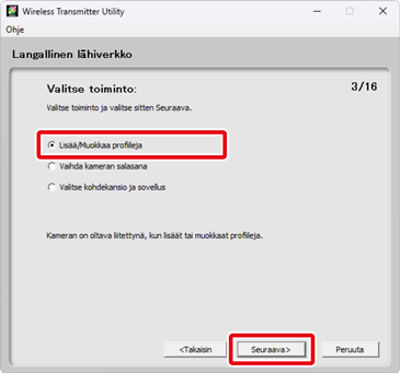 Jos haluat muokata olemassa olevaa verkkoprofiilia, valitse se ja napsauta kohtaa Seuraava. Jos haluat poistaa olemassa olevan profiilin, valitse se ja napsauta kohtaa Poista profiili. The Wireless Transmitter Utility -sovellusta ei voida käyttää sellaisten profiilien muokkaamiseen, jotka on suojattu kameran Salasanasuojaus-toiminnolla. Valitse Pois kohdassa Salasanasuojaus ennen profiilien poistamista tai muokkaamista.
