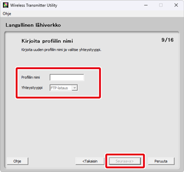 Kirjoita korkeintaan 16 merkkiä pitkä profiilin nimi ja valitse yhteystyyppi kohdasta FTP-lataus, Kuvan siirto, Kameran ohjaus tai HTTP-palvelin. Napsauta kohtaa Seuraava, kun asetukset ovat valmiit.