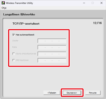 Jos valitsit Automaattinen asennus (suositellaan) vaiheessa 7, TCP/IP-asetukset säädetään automaattisesti. Siirry vaiheeseen 9. Huomaa, että Automaattinen asennus (suositellaan) ei ole käytettävissä, jos: