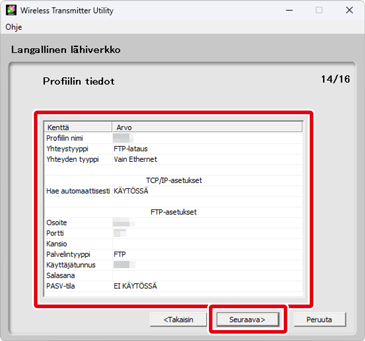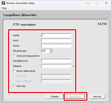 FTP-palvelimen asetukset ovat käytettävissä vain, jos FTP-lataus on valittu vaiheessa 6. Siirry Vaiheeseen 10, jos valittuna on toinen asetus. Kun olet säätänyt asetuksia, napsauta kohtaa Seuraava. Katso lisätietoja alla olevasta taulukosta.