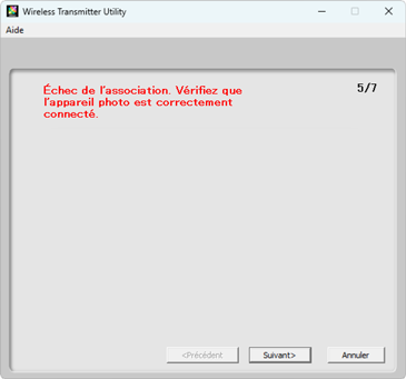 Wireless Transmitter Utility associe automatiquement l’appareil photo à l’ordinateur. Une fois l’association effectuée, l’appareil photo et Wireless Transmitter Utility affichent des messages à ce sujet ; appuyez sur la commande OK de l’appareil photo et cliquez sur Suivant dans Wireless Transmitter Utility.