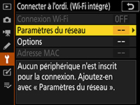 - Z7II / Z6II / Z7 / Z6 / Z5 / Z50 / Z30 / Zfc / D780 : Menu Configuration > Se connecter à l’ordinateur > Paramètres du réseau