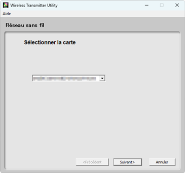 Suivez les instructions affichées à l’écran pour établir une connexion et démarrer Wireless Transmitter Utility. Lorsque vous y êtes invité, choisissez une carte réseau sans fil dans le menu déroulant dans Wireless Transmitter Utility.