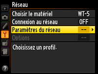 Sélectionnez Réseau > Paramètres du réseau dans le menu Configuration de l’appareil photo et suivez les instructions affichées à l’écran pour créer un profil réseau. Pour en savoir plus sur la création de profils Ethernet, reportez-vous au Guide réseau fourni avec l’appareil photo. Pour obtenir des informations sur l’utilisation du WT-7 ou WT-5, reportez-vous à la documentation fournie avec le produit.