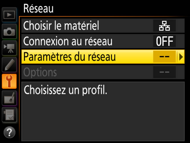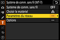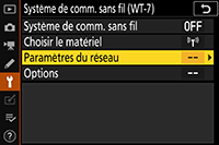 Sélectionnez Système de comm. sans fil (WT-7) > Paramètres du réseau dans le menu Configuration de l'appareil photo.