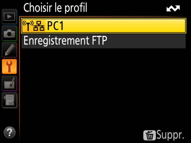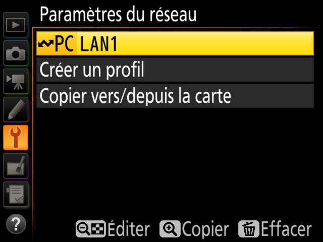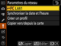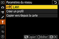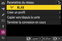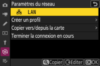 Mettez en surbrillance un profil et appuyez à droite du sélecteur multidirectionnel pour revenir au menu Réseau local câblé/WT. Attendez que l’appareil photo ait établi la connexion.