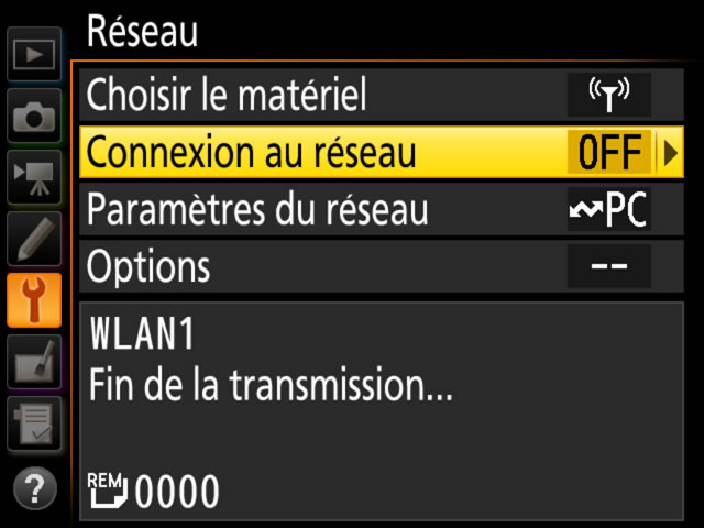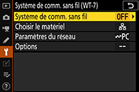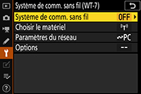 Sélectionnez Système de comm. sans fil (WT-7) > Choisir le matériel > Réseau sans fil dans le menu Configuration de l'appareil photo.