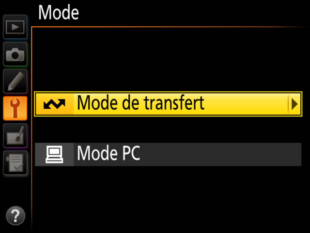 Vous avez le choix entre Mode de transfert et Mode PC. Lorsque vous appuyez à droite du sélecteur multidirectionnel, une liste de profils réseau s’affiche.