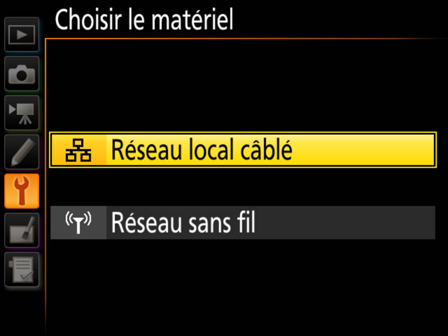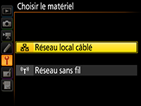 Sélectionnez Réseau > Choisir le matériel > Réseau local câblé dans le menu Configuration de l'appareil photo.
