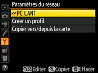 Mettez en surbrillance un profil et appuyez à droite du sélecteur multidirectionnel pour le sélectionner et revenir au menu Réseau. Si vous avez sélectionné Mode de transfert à l'étape 3, paramétrez Réglages de transfert comme décrit dans le manuel du WT-4.