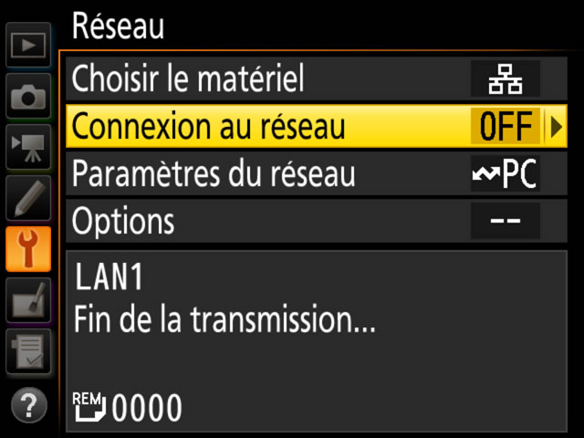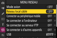 - Z9 : sélectionnez OFF pour Réseau local câblé dans le menu Réseau de l’appareil photo.