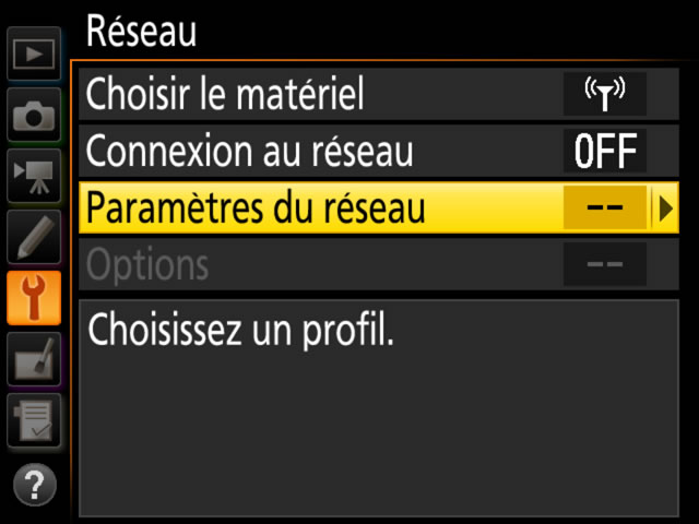 Sélectionnez Réseau > Paramètres du réseau dans le menu Configuration de l'appareil photo.