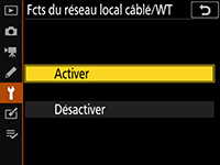 Sélectionnez Activer pour Réseau local câblé/WT > Fcts du réseau local câblé/WT dans le menu Configuration de l’appareil photo.