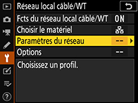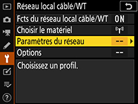 Sélectionnez Réseau local câblé/WT > Paramètres du réseau dans le menu Configuration de l'appareil photo.