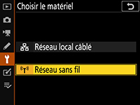 Sélectionnez Réseau > Choisir le matériel > Réseau sans fil dans le menu Configuration de l'appareil photo.