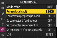 - Z9 : sélectionnez ON pour Réseau local câblé dans le menu Réseau de l’appareil photo.