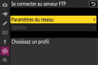 Sélectionnez Se connecter au serveur FTP > Paramètres du réseau dans le menu Réseau de l’appareil photo.