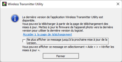 Selon le modèle de votre appareil photo, vous devrez peut-être mettre à jour non seulement Connection Profile mais aussi Wireless Transmitter Utility. Si tel est le cas, une boîte de dialogue de notification s’affichera lorsque vous démarrerez l’application. Vous pouvez également afficher la boîte de dialogue de notification à partir de l’option Vérifier les mises à jour du menu Aide.