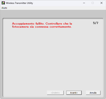 La Wireless Transmitter Utility accoppierà automaticamente la fotocamera e il computer. Quando l’accoppiamento è completo, la fotocamera e la Wireless Transmitter Utility visualizzeranno messaggi per confermarlo; premere il pulsante OK sulla fotocamera e fare clic su Avanti nella Wireless Transmitter Utility.