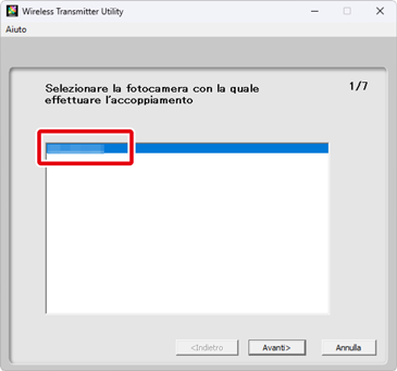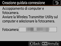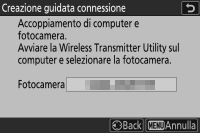 Seguire le istruzioni sullo schermo per stabilire una connessione e avviare la Wireless Transmitter Utility. La Wireless Transmitter Utility accoppierà automaticamente la fotocamera con il computer.