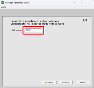 Inserire il codice di autenticazione nella Wireless Transmitter Utility e fare clic su Avanti.