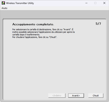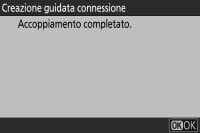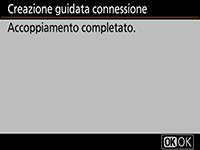 La Wireless Transmitter Utility accoppierà automaticamente la fotocamera e il computer. Quando l’accoppiamento è completo, la fotocamera e la Wireless Transmitter Utility visualizzeranno messaggi per confermarlo; premere il pulsante OK sulla fotocamera e fare clic su Avanti nella Wireless Transmitter Utility.