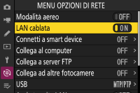 - Z9: selezionare ON per LAN cablata nel menu di rete della fotocamera.