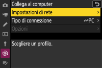 - Z8: selezionare USB-LAN per Connessione dati USB nel menu di rete della fotocamera.