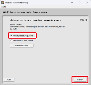 La configurazione wireless è ora completa. Per informazioni sulle modalità di connessione alla rete dalla fotocamera, vedere “Connessione mediante i profili creati su un computer”.