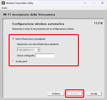 Se si è scelto Configurazione automatica (consigliata) allo step 7, le impostazioni della LAN wireless verranno regolate automaticamente. Selezionare Rete Infrastruttura (consigliato) o Access point e fare clic su Avanti per procedere allo step 10.