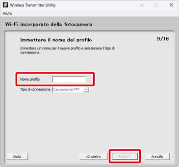 Immettere un nome profilo di un massimo di 16 caratteri e fare clic su Avanti. Solo profili Caricamento FTP possono essere creati; altri tipi di connessione non sono disponibili.