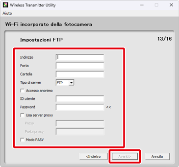 Regolare le impostazioni del server FTP e fare clic su Avanti. Per ulteriori informazioni, fare riferimento alla tabella seguente.