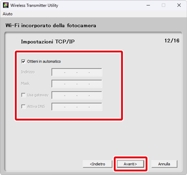Si noti che l’indirizzo IP deve essere diverso da quello dell’access point LAN wireless e del server FTP. Per esempio, se l’indirizzo IP dell’access point LAN wireless è “192.168.1.2”, quello del server FTP può essere “192.168.1.3” e quello della fotocamera può essere “192.168.1.4”. Si noti, tuttavia, che gli indirizzi IP per l’access point LAN wireless, la fotocamera e il server FTP devono tutti appartenere alla stessa classe.