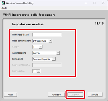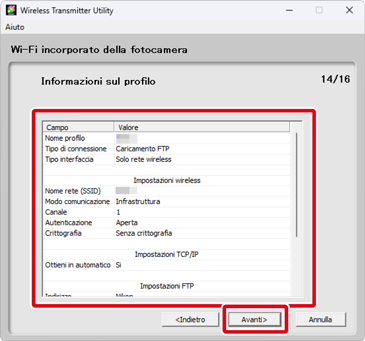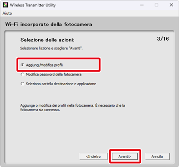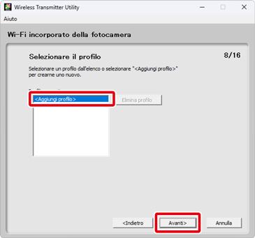 La Wireless Transmitter Utility può essere utilizzata solo per creare profili di rete per Caricamento FTP. Utilizzare la fotocamera per creare profili per Trasferimento foto e Controllo fotocamera.