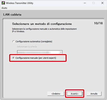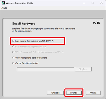 Selezionare LAN cablata (porta integrata/UT-1/WT-7) e fare clic su Avanti.