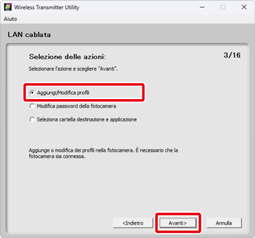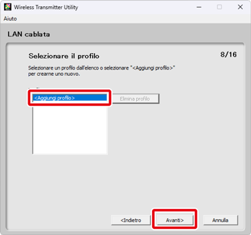 Per modificare un profilo di rete esistente, selezionarlo e fare clic su Avanti. Per eliminare un profilo esistente, selezionarlo e fare clic su Elimina profilo. Wireless Transmitter Utility non può essere usata per alterare i profili che sono stati protetti usando l'opzione della fotocamera Protezione con password. Scegliere No per Protezione con password prima di cancellare o modificare profili.