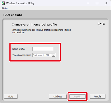 Immettere un nome profilo di 16 caratteri al massimo e scegliere un tipo di connessione da Caricamento FTP, Trasferimento foto, Controllo fotocamera o Server HTTP. Fare clic su Avanti al termine delle impostazioni.