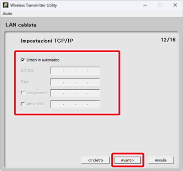 Se si è scelto Configurazione automatica (consigliata) allo step 7, le impostazioni TCP/IP verranno regolate automaticamente. Procedere allo step 9. Si noti che Configurazione automatica (consigliata) non sarà disponibile se: