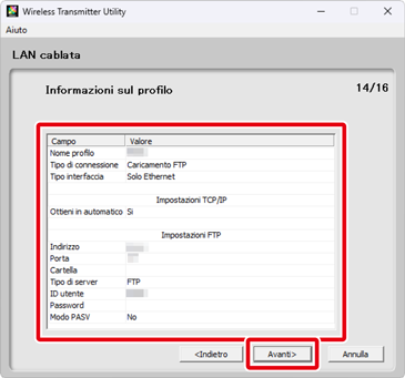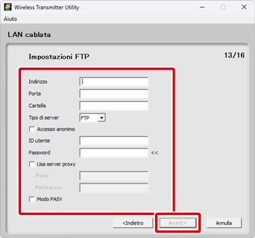 Le impostazioni del server FTP saranno disponibili solo se Caricamento FTP è selezionato nello step 6. Procedere allo step 10 se è selezionata un’altra opzione. Dopo aver regolato le impostazioni, fare clic su Avanti. Per ulteriori informazioni, fare riferimento alla tabella seguente.