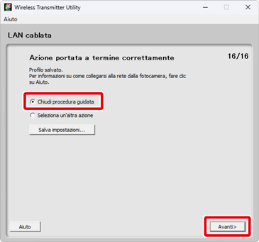 La configurazione Ethernet (LAN cablata) è ora completa. Per informazioni sulle modalità di connessione alla rete dalla fotocamera, vedere “Connessione mediante i profili creati su un computer”