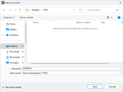 Fare clic su Salva impostazioni allo step 11 per salvare i profili di rete in formato “wts” o “txt”. Per caricare i profili salvati, fare clic su Carica file di impostazioni nello step 3, fare clic su Sfoglia e selezionare il file desiderato.