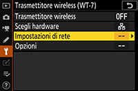Selezionare Trasmettitore wireless (WT-7) > Impostazioni di rete nel menu impostazioni della fotocamera.
