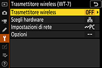Selezionare Trasmettitore wireless (WT-7) > Scegli hardware > LAN wireless nel menu impostazioni della fotocamera.