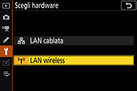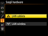 Selezionare LAN/WT cablata > Scegli hardware > LAN wireless nel menu impostazioni della fotocamera.