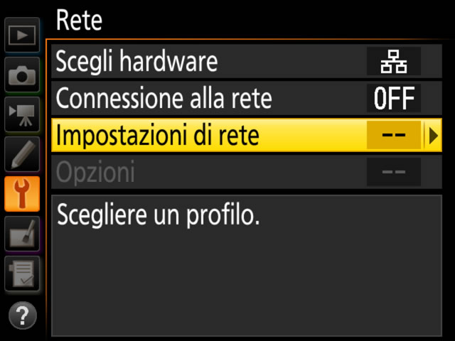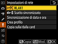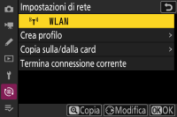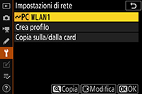 Selezionare un profilo e premere il multi-selettore a destra per confermare la selezione e tornare al menu Rete. Se era stato selezionato Modo trasferimento allo step 3, regolare Impostazioni trasferimento come descritto nel manuale del WT-4.