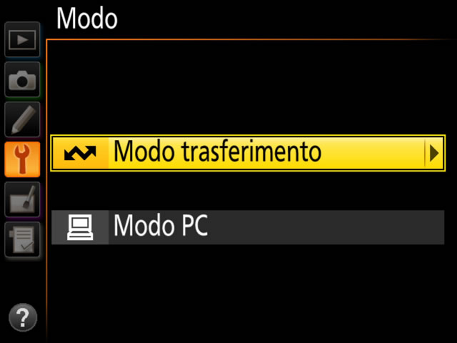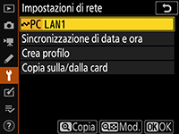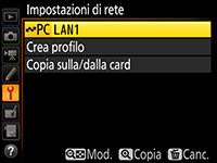 Selezionare Modo trasferimento e Modo PC. Premendo il multi-selettore a destra viene visualizzato un elenco di profili di rete.
