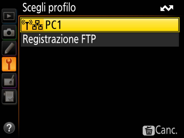 Selezionare un profilo e premere il pulsante OK per tornare al menu Collega a server FTP; a questo punto la fotocamera avvierà una connessione alla rete.