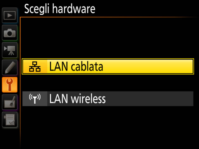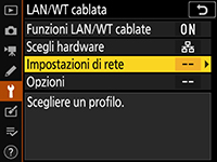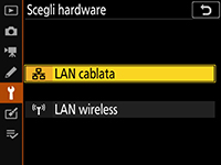 Selezionare LAN/WT cablata > Scegli hardware > LAN cablata nel menu impostazioni della fotocamera.